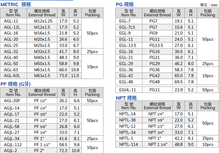 產品參數表