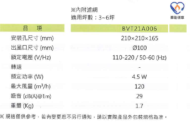 SUNON BVT21A015 變頻換氣扇21CM 5.3W