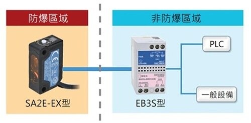 本質安全防爆構造的 SA2E-EX 型,需與本質安全防爆構造的 EB3S 型感測器隔離柵連接使用。
