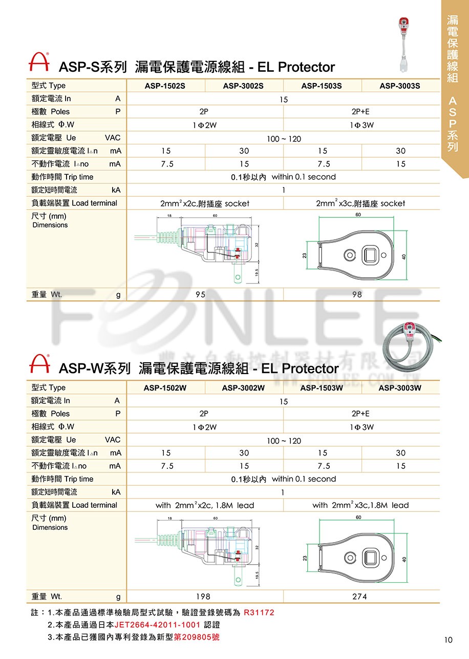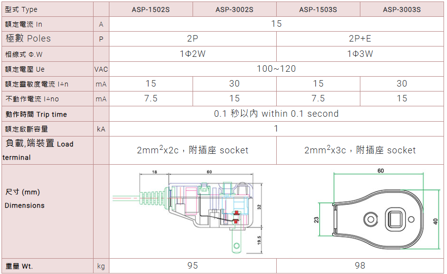 2P漏電保護+短母插15mA/110V ASP-1502D