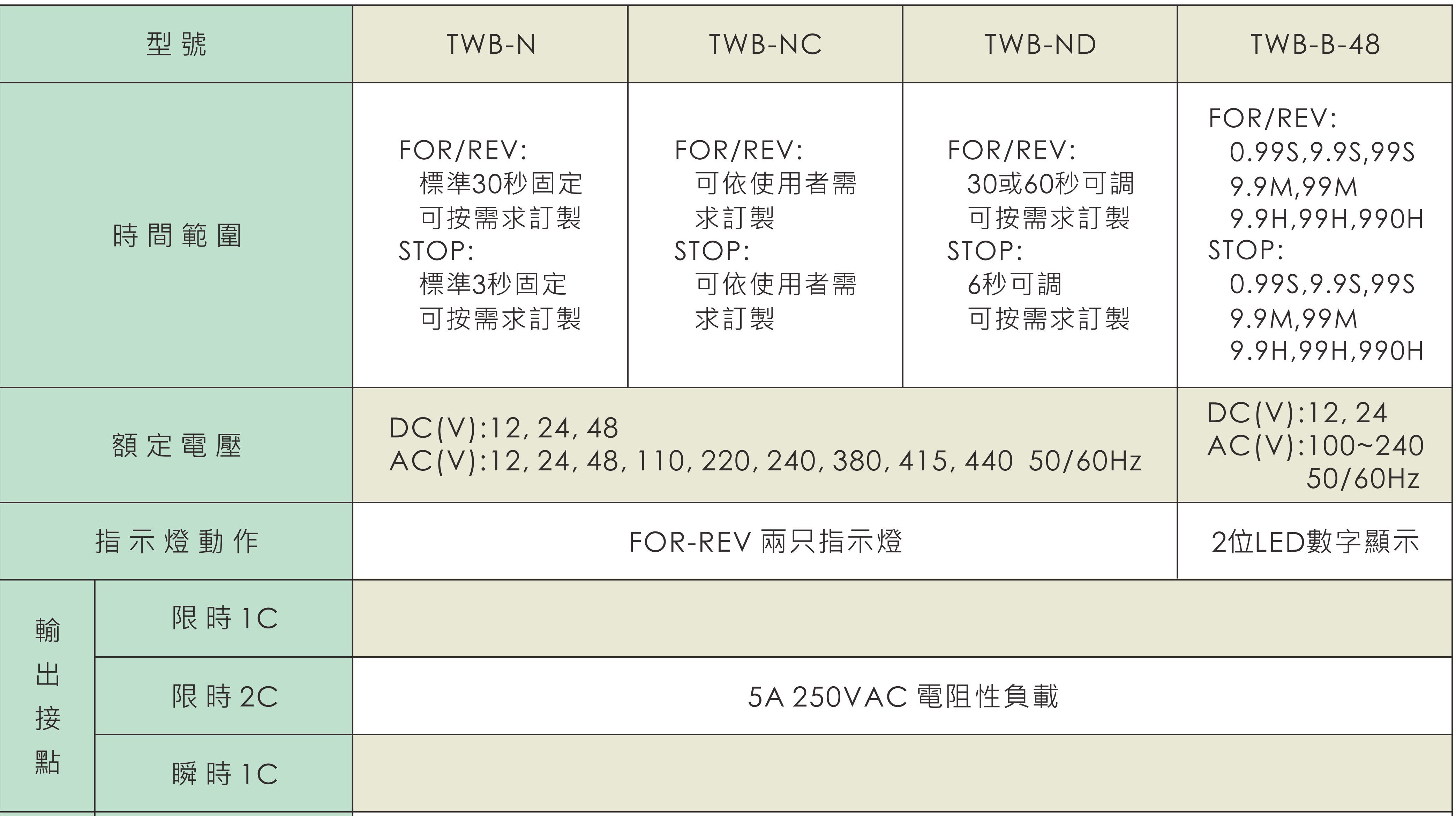 - 運轉時間可調(TWB-NC, TWB-ND, TWB-B-48)